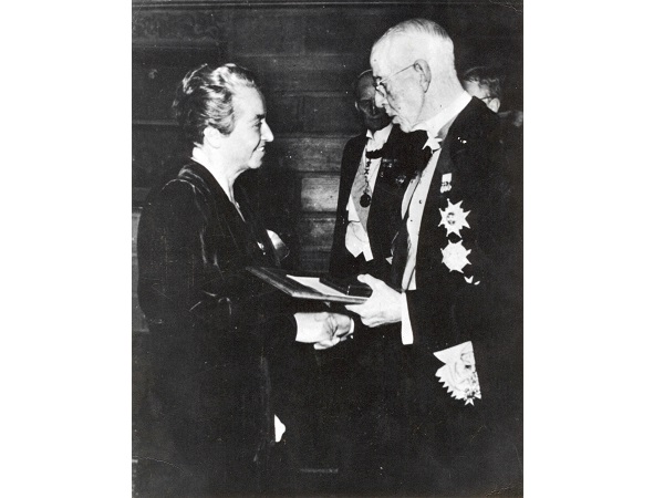 Estando también en Petrópolis, un 15 de noviembre de 1945, se enteró que la Academia Sueca le concedía el Premio Nobel de Literatura. Era el primero que recaía en América Latina, fruto de una candidatura promovida originalmente por intelectuales a lo largo y ancho del continente, partiendo en Ecuador. La ceremonia de entrega se realizó en el Palacio de Conciertos de Estocolmo (Suecia), el 10 de diciembre, encabezada por el rey Gustavo V.